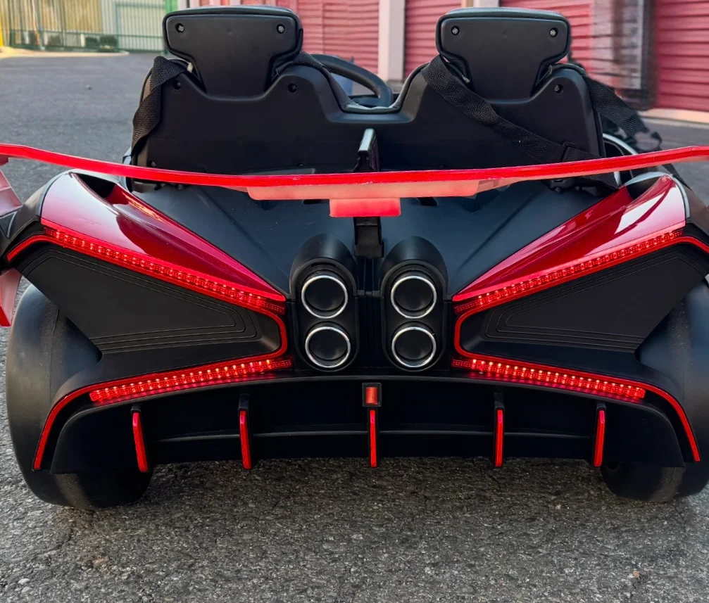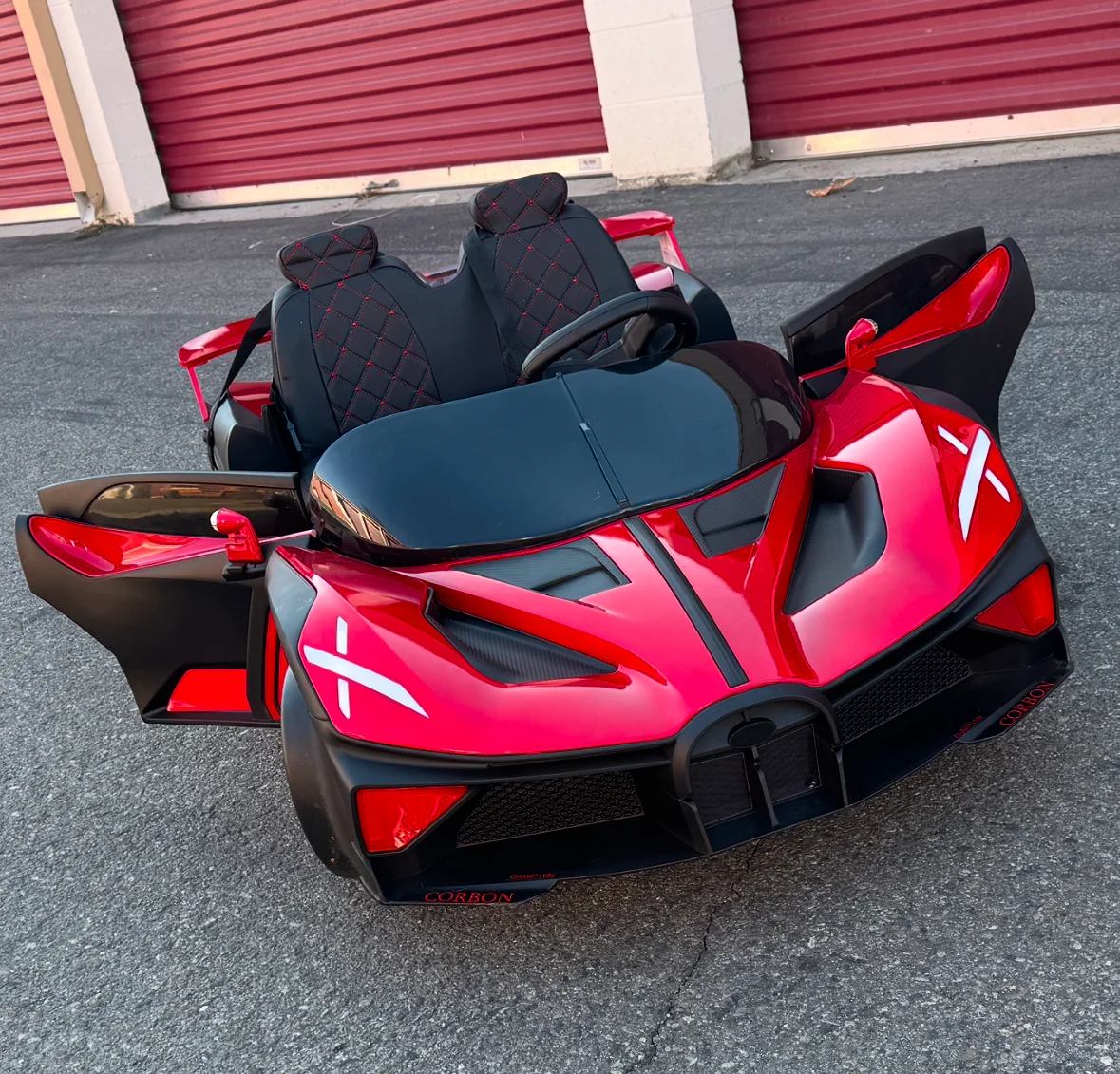 24V ride-on Bugatti with leather seats, rubber soft wheels, and parental remote. Includes Bluetooth, LED lights, and a drift riding option for extra fun.